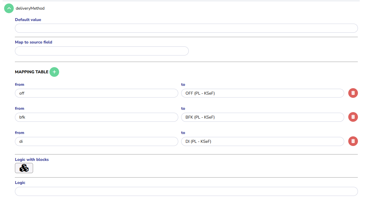Content | Poland | New SAF-T requirements | Effective 1 February 2026, Poland updated the JPK_VAT structure to new versions JPK_V7M(3) and JPK_V7K(3) to align with the mandatory National e-Invoicing System (KSeF). As part of this change, taxpayers are required to report the KSeF invoice number where available, and where it is not, to indicate one of the new delivery methods (OFF, BFK, or DI). We have implemented support for these changes by introducing two new properties—“number” and “deliveryMethod”—within the eInvoicing data mappings object. Please update your mapping files to accommodate these new SAF-T XML elements accordingly. Delivery method The properties are named as "OFF (PL - KSeF)", "BFK (PL - KSeF)", and "DI (PL - KSeF)", in our data model and could be mapped using logic, or by using Mapping Table like this: