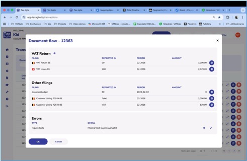 Fig 4: The Document flow dialog showing VAT returns, other filings, and any errors for a transaction.