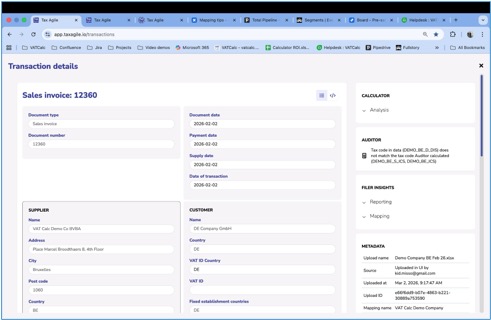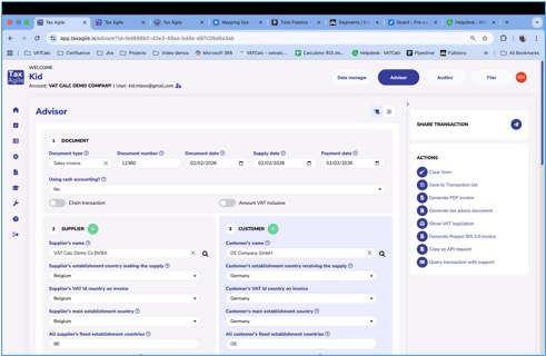 To model or review the tax treatment of a transaction, click Advisor icon (the third action button) on any row. This opens the transaction directly in the Advisor, where all fields are pre-populated and you can explore the VAT calculation, generate documents, or query the transaction with support.