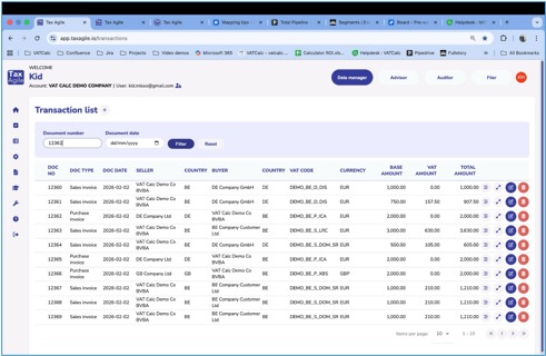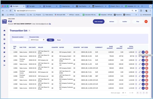 The Transaction list displays all uploaded transactions in a table. Each row shows the key fields for a transaction including the document number, document type, document date, seller, buyer, country, VAT code, currency, base amount, VAT amount, and total amount.