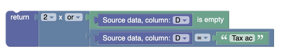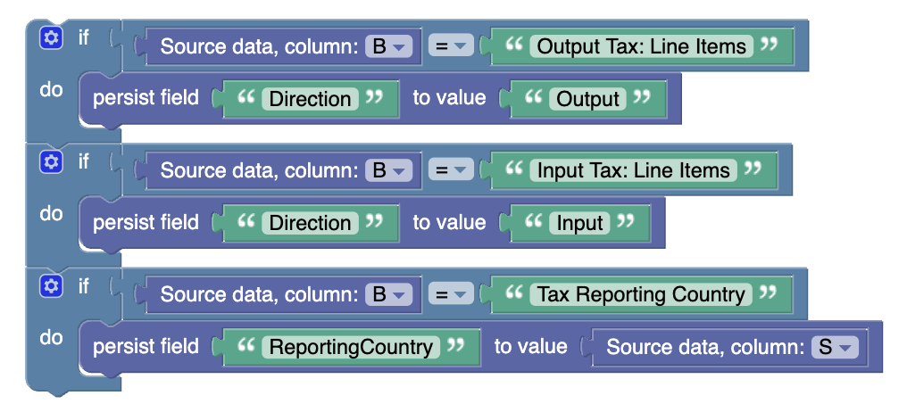 Create persistField "Direction" sections for Output and Input based on column B (or whatever column contains it) " Output Tax: Line Items" or " Input Tax: Line Items". These are like variables you can reference in the cell selection logic.