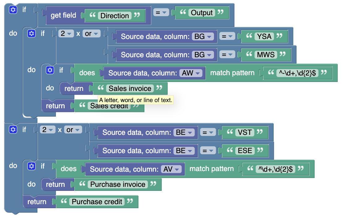 ESE and ESA. These are reverse charges. An ESE is the deductible VAT and ESA is the reversing entry. VATCalc reversed tax codes automatically create the corresponding offset so we only need the ESE document types. We can skip or disregard the the ESA ones in the mapping (skipping is preferred since we do not end up with lots of disregarded transactions loaded and visible in Auditor and the ledgers).